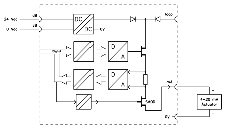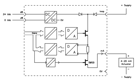 Güvenli analog çıkış modülü SAO-0220m, analog kontrol uygulamaları için iki adet 0(4)-20 mA çıkış kanalına sahiptir. Yük yalnızca dirençli veya kapasitif olabilir. Endüktif yükler, analog çıkış modülünün arızalı olarak raporlanmasına neden olur. İki analog çıkış, 24 Vdc ve 5 Vdc'den galvanik olarak izole edilmiştir. Modül üzerinde 0 V 1 (d14) pini ve 0 V 2 (d20) pini birbirine bağlıdır. Her analog çıkış kanalı, çıkış değeri için 12 bitlik bir D/A dönüştürücü ve çıkış değerini okuyan bir A/D dönüştürücüden oluşur. A/D dönüştürücü kullanılarak, çıkış kanalının doğru çalışması kontrol edilebilir. Yapılandırılmış Tanılama Test Aralığı içinde, analog çıkışlar şunlar için test edilir: