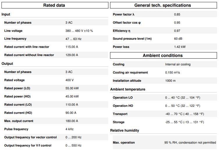 SINAMICS G120 PM240 Güç Modülü, entegre frenleme kıyıcılı, filtresiz, 380-480 V 3 AC +10/-10% 47-63 Hz, yüksek aşırı yük gücü: 45 kW %200 3 s, %150 57 s, %100 240 s, ortam sıcaklığı -10 ila +50 °C, düşük aşırı yük gücü: 55 kW %150 3 s, %110 57 s, %100 240 s, ortam sıcaklığı -10 ila +40 °C, 634 x 350 x 316 (YxGxD), FSF, IP20 koruma sınıfı (Kontrol Ünitesi ve BOP hariç).